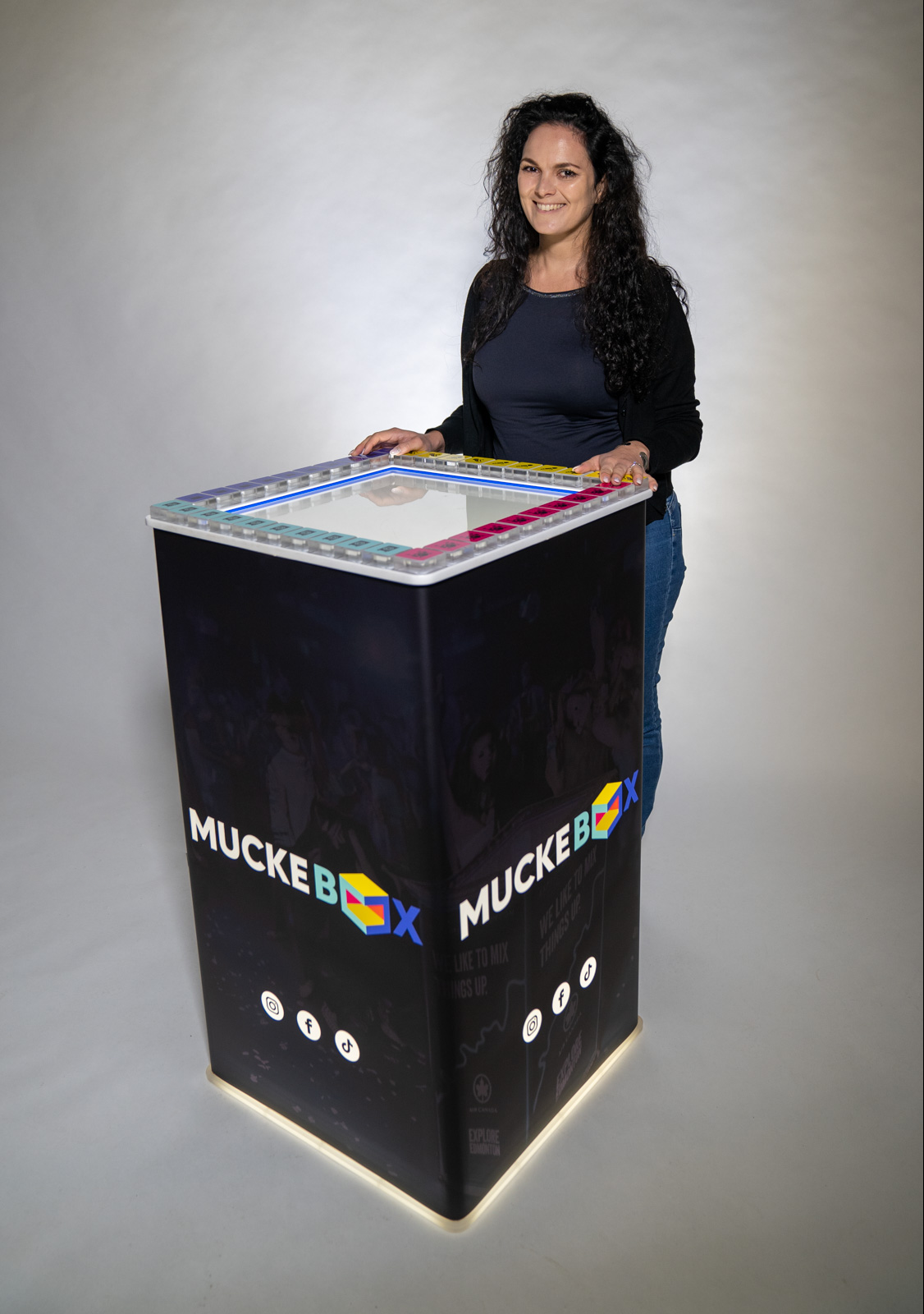 Unsere Muckeboxen sind 1m hoch, die Spielfläche beträgt 50x50cm. Bis zu 4 Spieler können gleichzeitig gemeinsam Musik machen. Es ist kein Musiktalent nötig, es klingt immer professionell. Wir wechseln bei eurem Event auf Wunsch zwischen bis zu 15 Musikstilen, von Hip Hop, Rock, Latino, bis zu House, Techno, Funk u.v.m.